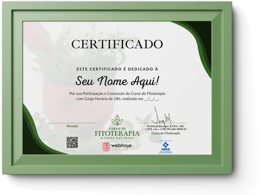 Ao finalizar o curso de Fitoterapia, você ira baixar um lindo certificado de conclusão válido em todo o território nacional. Este certificado não só comprova a sua dedicação e empenho, mas também valoriza o conhecimento adquirido, proporcionando uma prova concreta de sua qualificação.